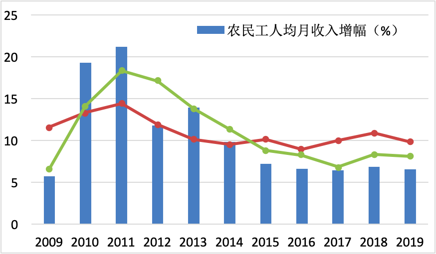 农民工工资在2010年前后曾有过较快的提高,主要得益于各地最低工资的调整。值得注意的是,农民工工资收入相对增速2015年后开始下降。农民工年平均收入2017年是城镇非私营单位职工平均收入的56%,2019年下降为52.5%。