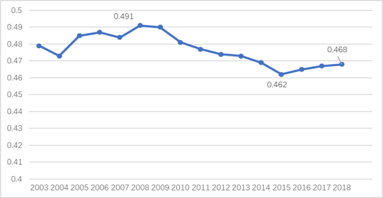 2013年时,一些人曾乐观地认为随着人均GDP的增长,中国的库兹涅茨收入曲线拐点到了,但2015年后至今,我国基尼系数又有微量提升,2015年是0.462,2018是0.468,2019年是0.465,仍处于世界上收入分配差距最大的组别。我国以及欧美国家近10多年收入分配格局的变动情况说明,上世纪50年代库兹涅茨提出分配倒U曲线假设已经失效。