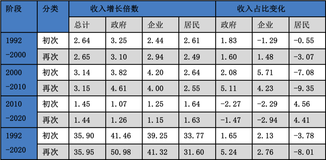 表1:政府、企业、居民三大部门收入占比(1992-2020)