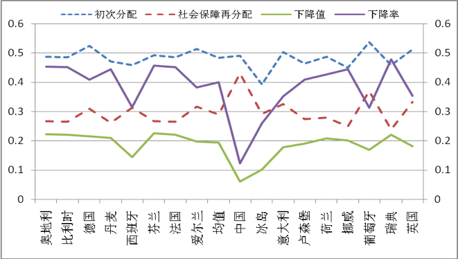 我国社会保障制度在平抑一次分配差距方面还远没有发挥应有的作用。据北师大收入分配研究院2017年的一项研究,18个欧盟国家市场收入的基尼系数为0.443,在社会保障的作用下,这些国家的可支配收入基尼系数降为0.29。从下降幅度来看,欧盟国家政府的社会保障政策使得其基尼系数的平均值下降了40%,相比之下,中国仅下降了12.3%。