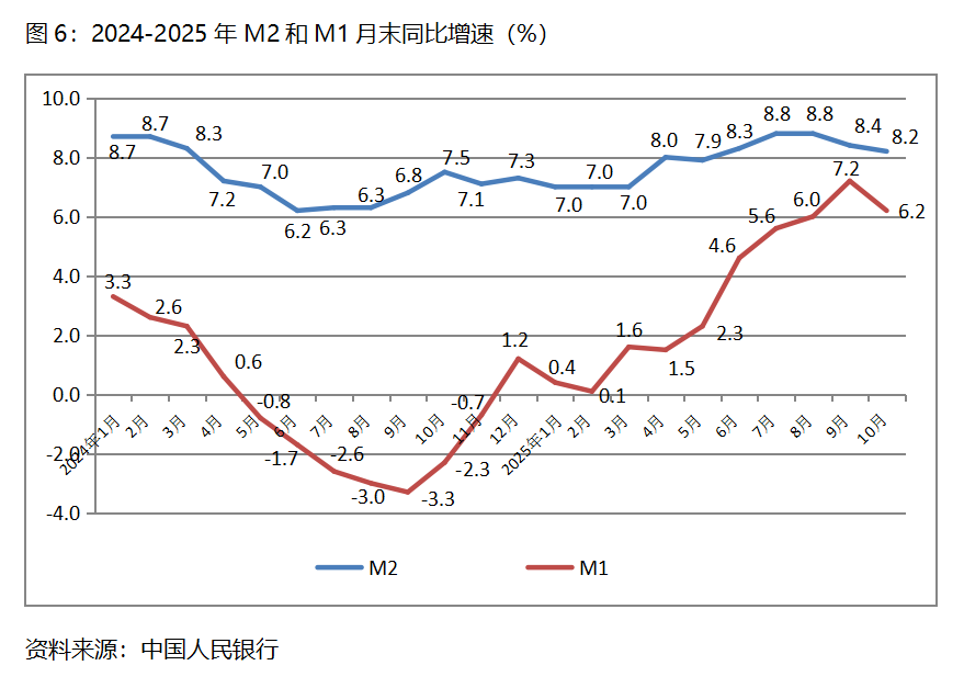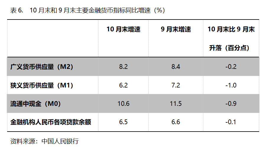 六、M2增速持续回落。10月末,广义货币供应量(M2)同比增长8.2%,比9月末增长8.4%回落0.2个百分点,9月末比8月末增长8.8%回落0.4个百分点;狭义货币供应量(M1)同比增长6.2%,比9月末增长7.2%回落1.0个百分点,9月末增幅比8月末增长6.0%回升1.2个百分点;流通中货币(M0)同比增长10.6%,比9月末增长11.5%回落0.9个百分点,9月末比8月末增长11.7%回落0.2个百分点。10月份末,M2、M1和M0增速均出现了回落,需要关注其对经济运行走势的影响。