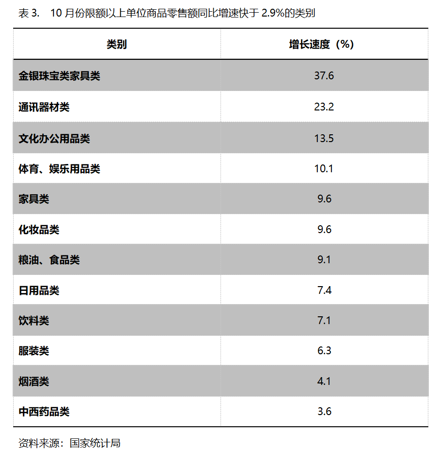 10月份,限额以上单位商品零售额同比增速快于社会消费品零售总额2.9%增速的共有12类,即金银珠宝类增长37.6%,通讯器材类增长23.2%,文化办公用品类增长13.5%,体育、娱乐用品类增长10.1%,家具类增长9.6%,化妆品类增长9.6%,粮油、食品类增长9.1%,日用品类增长7.4%,饮料类增长7.1%。服装类增长6.3%。烟酒类增长4.1%,中西药品类增长3.6%。