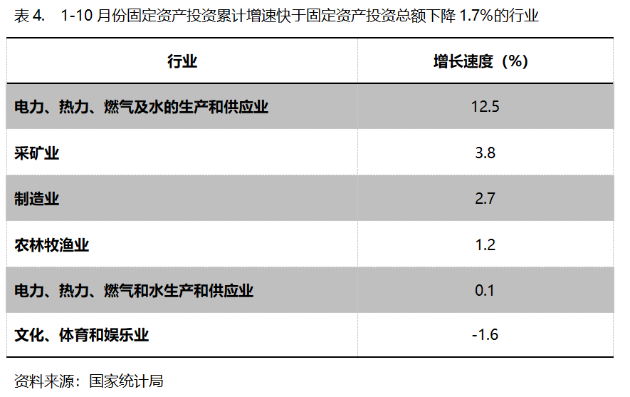 1-10月份,固定资产投资累计增速快于固定资产投资总额下降1.7%的行业共6个,即电力、热力、燃气及水的生产和供应业增长12.5%,采矿业增长3.8%,制造业增长2.7%。农林牧渔业增长1.2%,交通运输、仓储和邮政业增长0.1%,文化、体育和娱乐业下降1.6%。