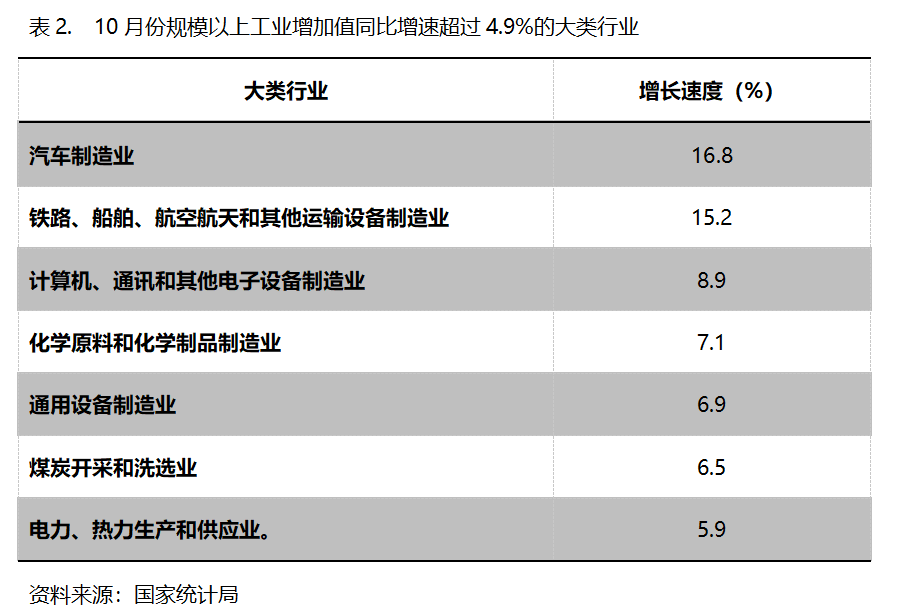 10月份,增长速度超过规模以上工业增长4.9%的主要大类行业共有7个,即汽车制造业增长16.8%,铁路、船舶、航空航天和其他运输设备制造业同比增长15.2%,计算机、通讯和其他电子设备制造业增长8.9%,化学原料和化学制品制造业增长7.1%,通用设备制造业增长6.9%,煤炭开采和洗选业增长6.5%,电力、热力生产和供应业增长5.9%。