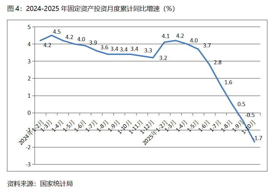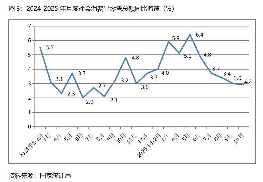 三、零售增速持续回落。10月份,社会消费品零售总额同比增长2.9%,比9月份增长3.0%回落了0.1个百分点,9月份比8月份增长3.4%回落了0.4个百分点,其中,餐饮收入增速回升,商品零售额增速回落,10月份餐饮收入同比增长3.8%,比9月份增长0.9%回升了2.9个百分点;商品零售额增长2.8%,比9月份增长3.3%回落0.5个百分点。10月份社会消费品零售总额增速是今年以来月份的最低增速。