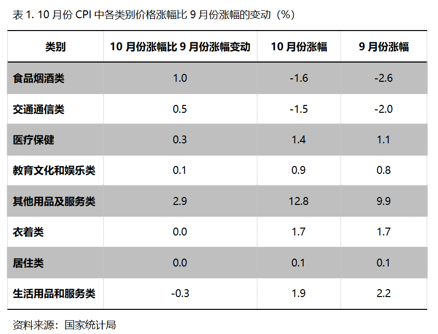 10月份,在CPI 8个类别中有5个类别同比涨幅回升,2个类别持平,1个类别回落。涨幅回升的5个类别包括食品类价格降幅缩小1.0个百分点,交通类降幅缩小0.5个百分点,医疗保健类涨幅回升0.3个百分点,教育文化和娱乐类涨幅回升0.1个百分点,其他用品和服务类涨幅回升2.9个百分点;涨幅持平的2 个类别包括衣着类和居住类;涨幅回落的生活用品及服务类涨幅回落0.3个百分点。
