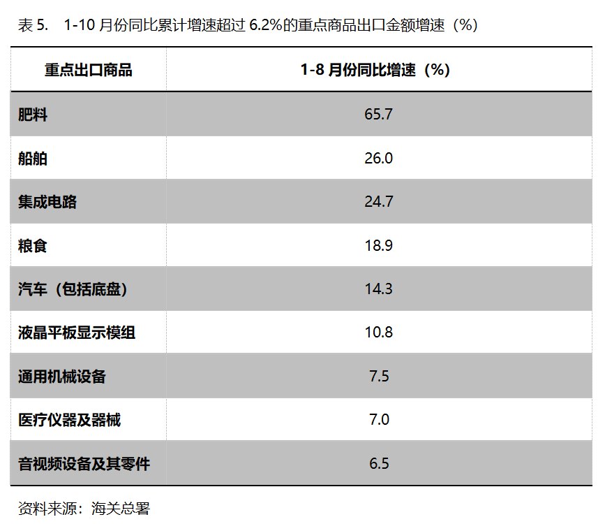 1-10月份,出口金额同比增速超过6.2%的重点商品共有9类,即肥料出口增长65.7%,船舶增长26.0%,集成电路增长24.7%,粮食增长18.9%,汽车(包括底盘)增长14.3%,液晶平板显示模组增长10.8%,通用机器设备增长7.5%,医疗仪器及器械增长7.0%,音视频设备及其零件增长6.5%。