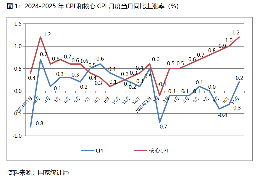 一、CPI涨幅持续回升。10月份,CPI同比上涨0.2%,9月份为下降0.3%,8月份为下降0.4%;核心CPI同比上涨1.2%,比9月份上涨1.0%回升了0.2个百分点,9月份涨幅比8月份上涨0.9%回升了0.1个百分点。CPI和核心CPI涨幅持续保持回升的态势,表明经济运行活力有所增强,但由于涨幅均较为有限,加之较长时期处于较低水平,经济运行活力总体仍比较弱。
