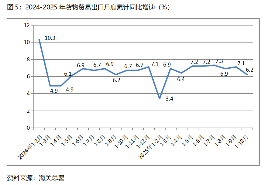 五、出口增速由升转落。1-10月份,货物出口同比增长6.2%,比1-9月份增长7.1%回落0.9个百分点,1-9月份比1-8月份增长6.9%回升0.2个百分点。货物出口对主要贸易出口经济体增速均出现回落,1-10月份对欧盟出口同比增长8.4%,比1-9月份对欧盟出口同比增长9.2%回落0.8个百分点;对美国出口下降17.1%,比1-9月份下降16.2%扩大0.9个百分点;对东盟出口增长15.3%,比1-9月份增长15.8%回落0.5个百分点;对拉丁美洲出口增长7.3%,比1-9月份增长7.8%回落0.5个百分点;对非洲出口增长27.2%,与1-9月份增长29.4%回落2.2个百分点。尽管1-10月份出口保持了不低的增速,但10月份出现0.8%的下降,值得引起密切关注。
