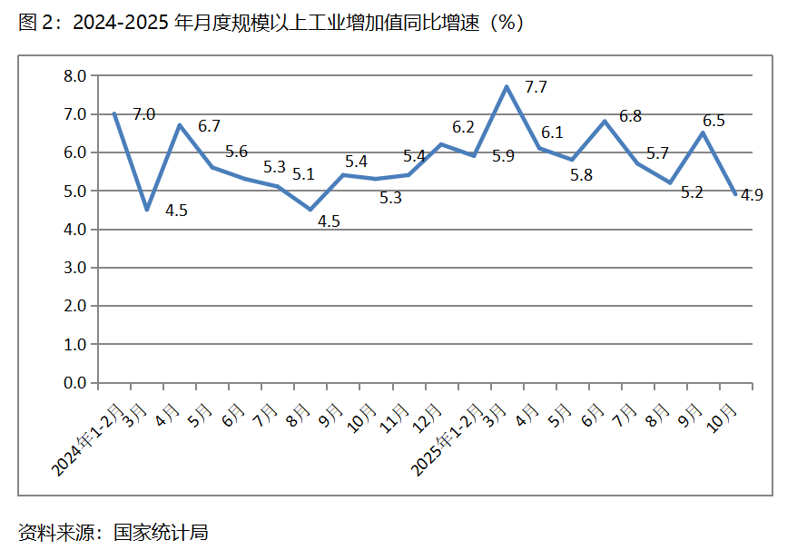 二、工业增速由升转落。10月份,规模以上工业增加值同比增长4.9%,比9月份增长6.5%回落了1.6个百分点,9月份比8月份增长5.2%回升了1.3个百分点。从工业三大门类看,采矿业和制造业增速比上月回落,电力、热力、燃气及水生产和供应业增速回升,10月份,采矿业同比增长4.5%,比上月增长6.4%回落1.9个百分点;制造业增长4.9%,比上月增长7.3%回落2.4个百分点;电力、热力、燃气及水生产和供应业增长5.4%,比上月增长0.6%回升4.8个百分点。值得关注的是,10月份工业增速回落到了今年月份增速的最低点。
